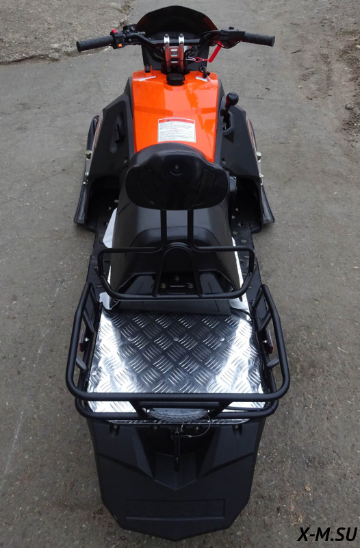 Армированная гусеница снегохода обладает хорошим сцеплением со снегом и обеспечивает безопасность райдеру. Кроме того, она позволяет устройству преодолевать подъемы с уклоном до 20°. На снегоходе установлена: передняя подвеска — рычажная с амортизатором.